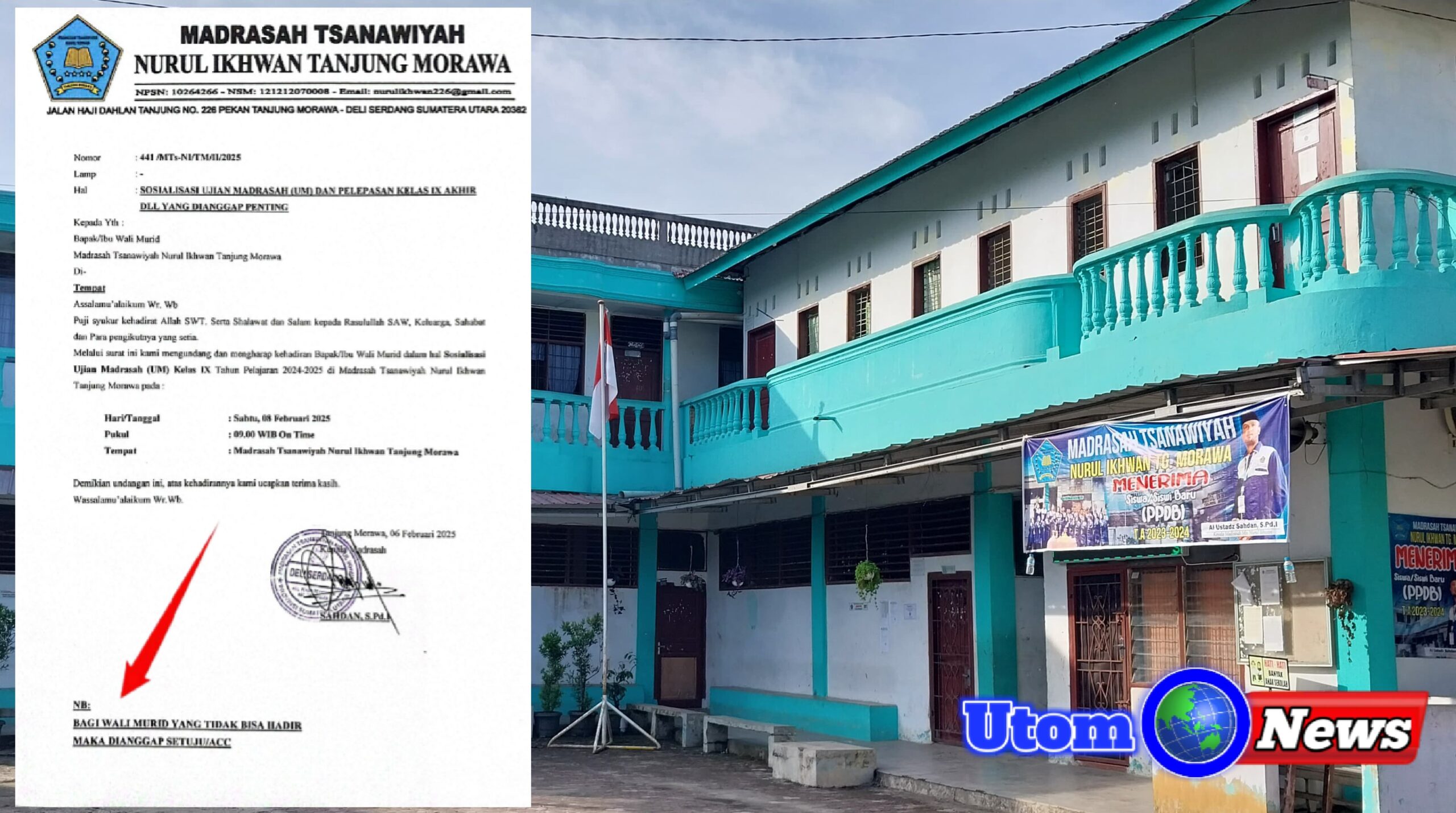 TANJUNG MORAWA | Pada tanggal 6 Februari 2025 orang tua wali murid Nurul Ikhwan Tanjung Morawa Kabupaten Deli Serdang, diberitahukan pihak sekolah melalui surat undangan untuk menghadiri rapat sosialisasi ujian madrasah dan pelepasan siswa siswi kelas sembilan (9). Yang bakal diadakan di bulan Mei.