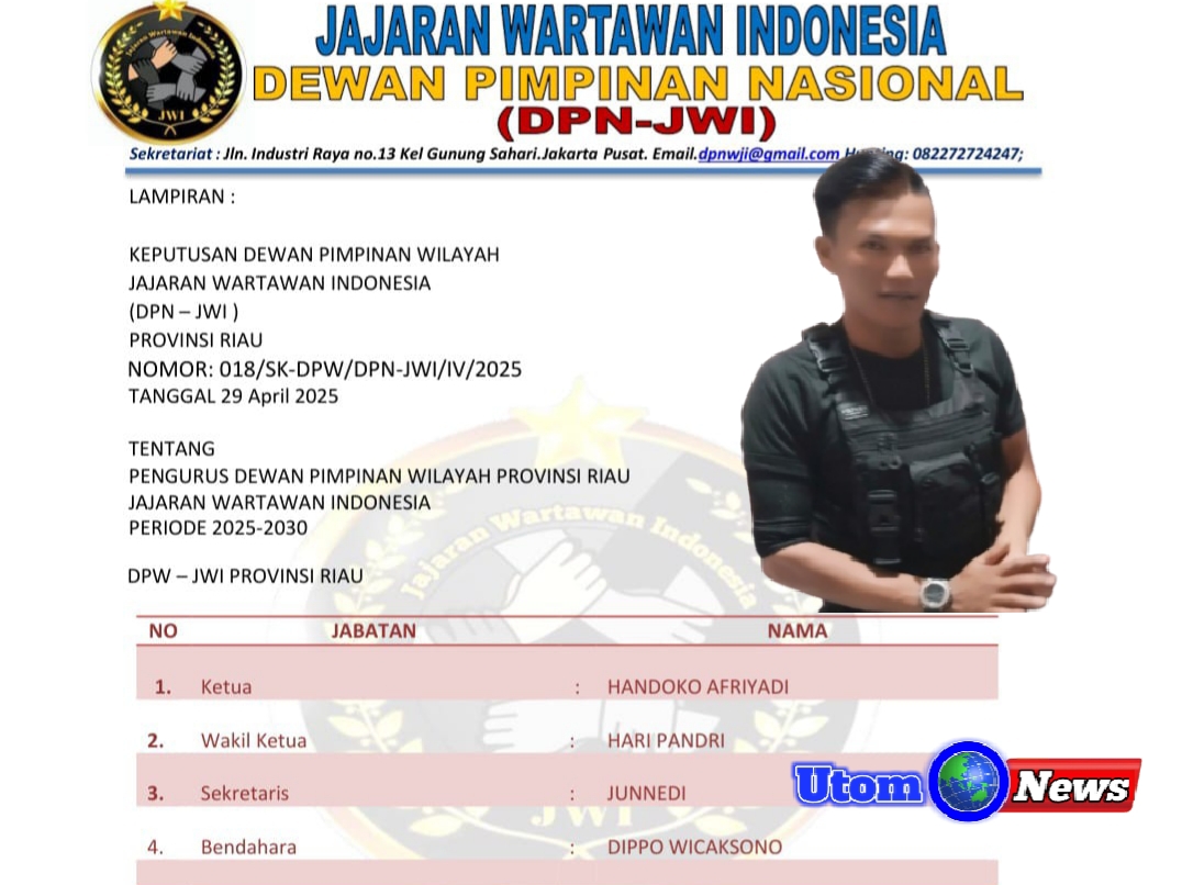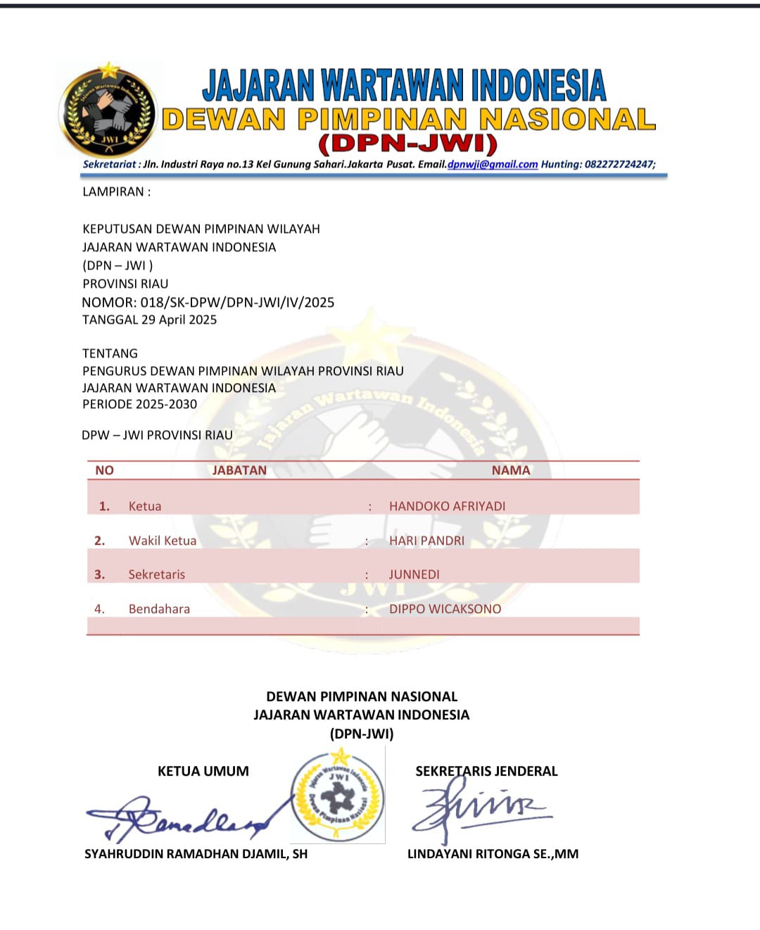 Tapi dengan semangat yang kuat seorang Handoko Afriyadi dan rekan rekannya dalam waktu 3 hari yang begitu singkat. Pada tanggal 1 Mei 2025 tepatnya di hari buruh (May Day) Dewan Pimpinan Nasional Jajaran Wartawan Indonesia di Jakarta. Telah menerbitkan, memberikan Surat Keputusan (SK) JWI Provinsi Riau dengan nomor SK: 018/SK-DPW/DPN-JWI/IV/2025, pada tanggal 29/4/2025 periode 2025-2030.