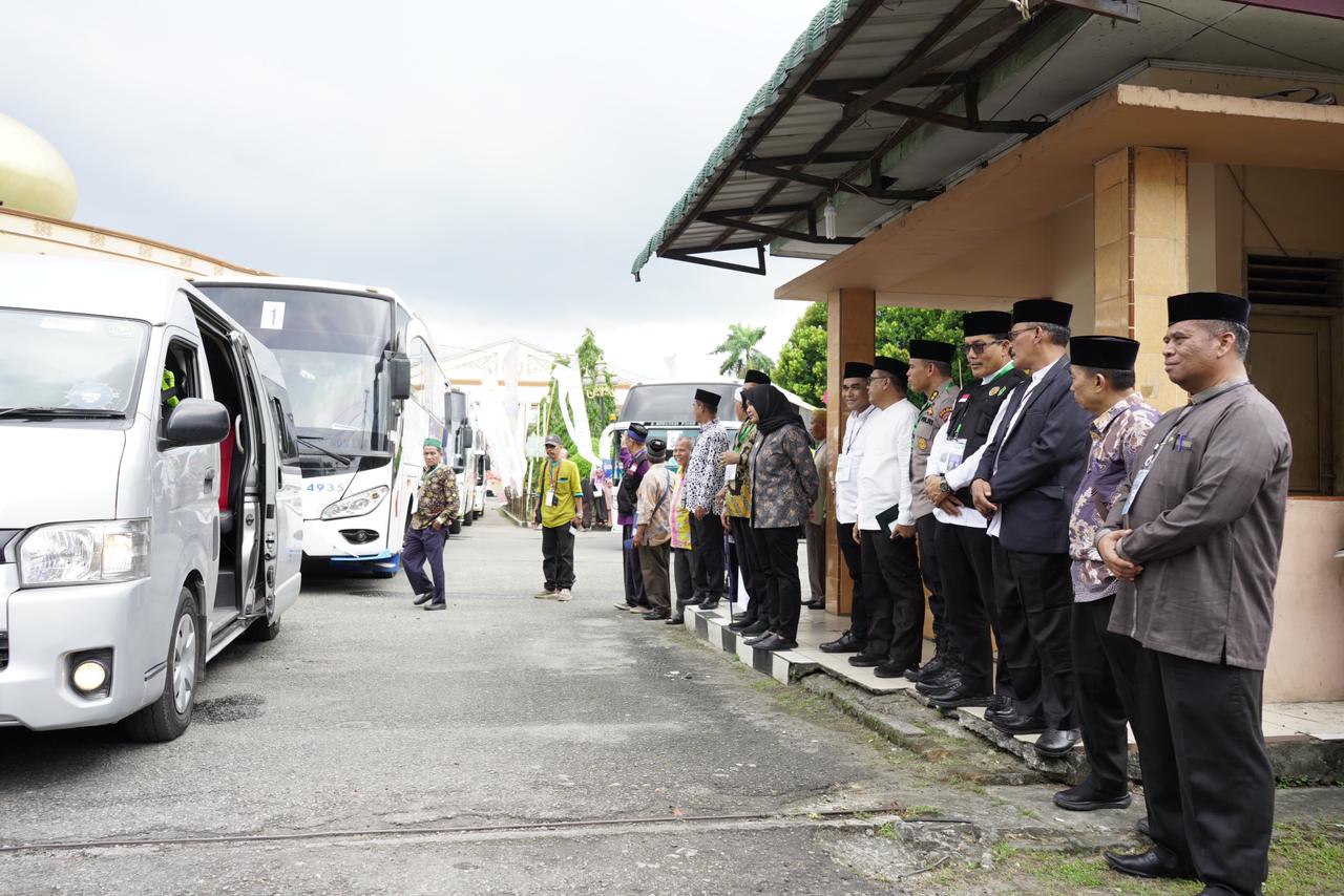 Ketua Petugas Penyelenggara Ibadah Haji (PPIH) Embarkasi Medan Tahun 1446 H/ 2025 M, H. Ahmad Qosbi,S.Ag, MM bersama Bupati Mandailing Natal H. Saipullah Nasution, SH, MM melepas secara resmi keberangkatan jemaah calhaj melalui penyerahan Pataka Merah Putih kepada TPHI Kloter 10 Embarkasi Medan dan penyerahan surat-surat kepercayaan kepada Petuas Kloter di Aula 1 Madinatul Hujjaj Asrama Haji Medan, Minggu (11/5/2025).