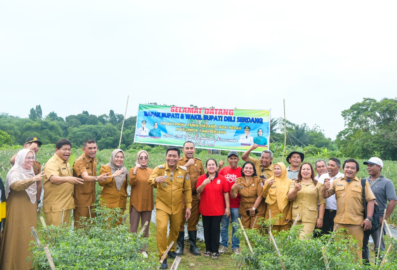 “Cabai merupakan salah satu komoditas strategis yang sangat memengaruhi inflasi di Kabupaten Deli Serdang. Harga cabai yang fluktuatif, mulai dari Rp15 ribu hingga Rp80 ribu per kilogram, perlu dicarikan solusi agar petani tetap sejahtera,” ucap Wakil Bupati (Wabup) Deli Serdang, Lom Lom Suwondo SS yang hadir bersama Ketua I Bidang Pembinaan Karakter Keluarga, Ny Asniar Lom Lom Suwondo, pada Panen Perdana Cabai Merah bersama Kelompok Tani Bersama di Desa Deli Tua, Kecamatan Namorambe, Selasa (30/12/2025).