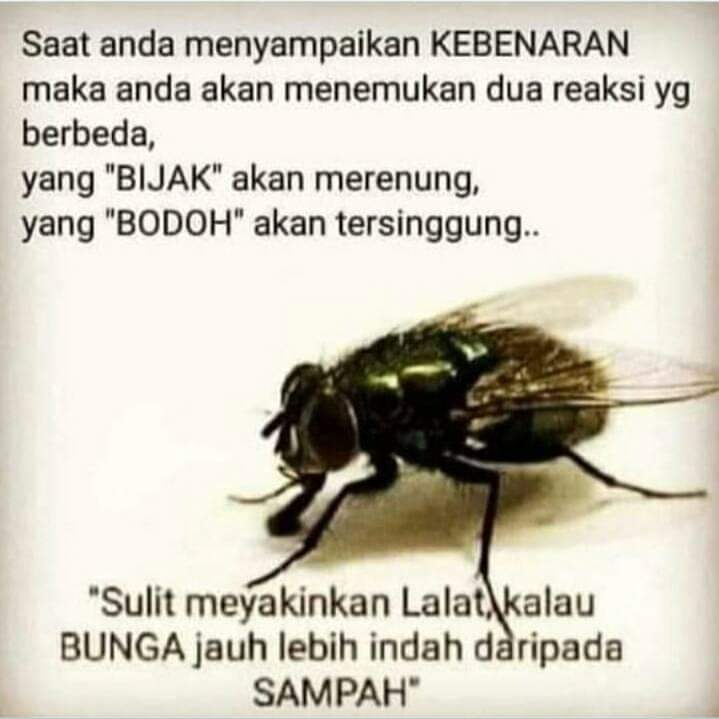 Cobalah tarik ia ke bunga mawar yang harum, kelopaknya segar dan nektar manis menggoda, tapi apa yang terjadi? Lalat itu kembali lagi ke sampah! Begitulah perumpamaan sempurna untuk sifat manusia yang sok pintar, alias dungu sejati: sulit sekali diubah.