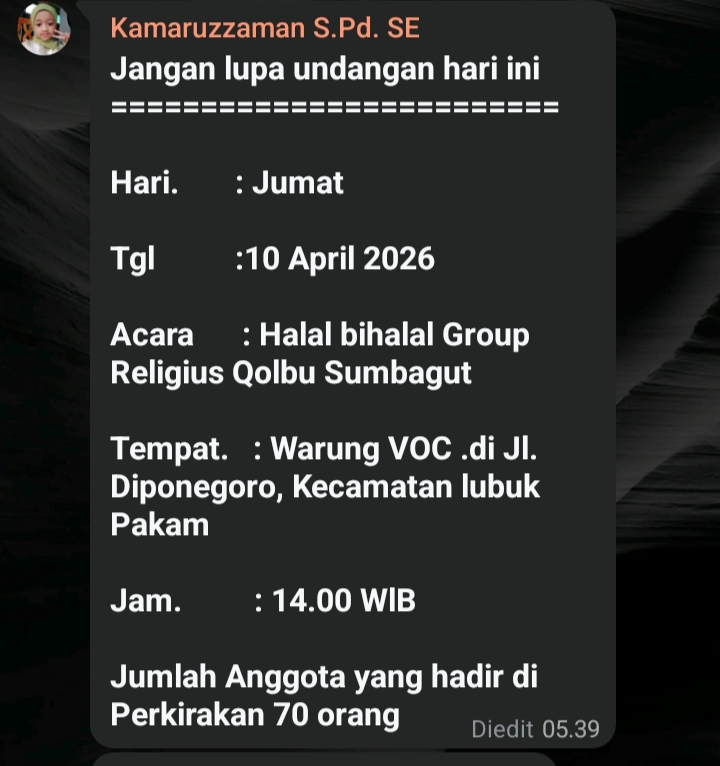 Penting untuk Diingat, Bagi yang belum konfirmasi kehadiran, panitia mengingatkan agar segera hadir tepat waktu mengingat hari ini adalah jadwal utama. “Jangan lupa undangan hari ini,” pesan Ketua panitia Hj Jerniati melalui grup internal, menekankan komitmen kolektif untuk menjaga tradisi halal bihalal sebagai bagian dari budaya gotong royong Sumatera Utara.